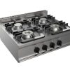 Piano superiore in acciaio inox AISI 304 18/10 stampato con impronta raccogli-liquidi, profondità 22 mm. Bruciatori fuochi aperti in ghisa cromati monocorona 4,5 kW, con termocoppia e pilota protetta. Accensione fuochi manuale. Griglia monofuoco in ghisa smaltata lucida porcellanata resistente agli acidi. Manopole e maniglie in materiale atermico. Piedini in acciaio inox AISI 304 18/10 regolabili in altezza. Certificazione di conformità CE.