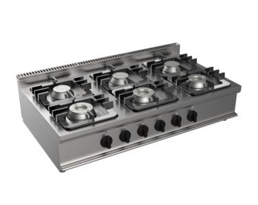 Cucina da banco in acciaio inox a sei fuochi ad accensione manuale.
